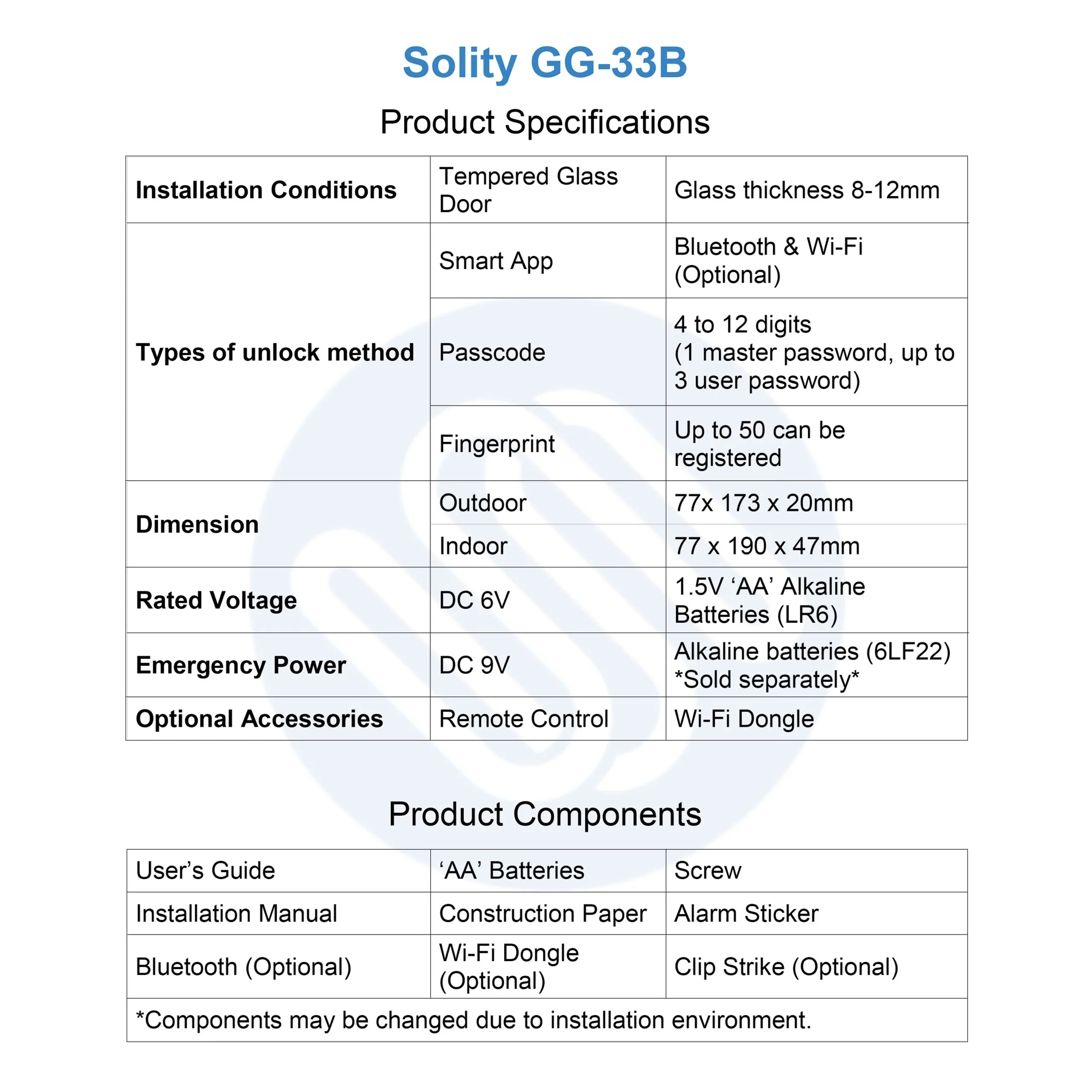 The lock is designed to be water splash resistant, making it suitable for various environments. Powered by standard AA batteries with an emergency backup option, it ensures continuous operation even during power shortages. With its modern aesthetics, reliable performance, and smart features, the Solity GG-33B is an ideal choice for securing glass doors with style and confidence.